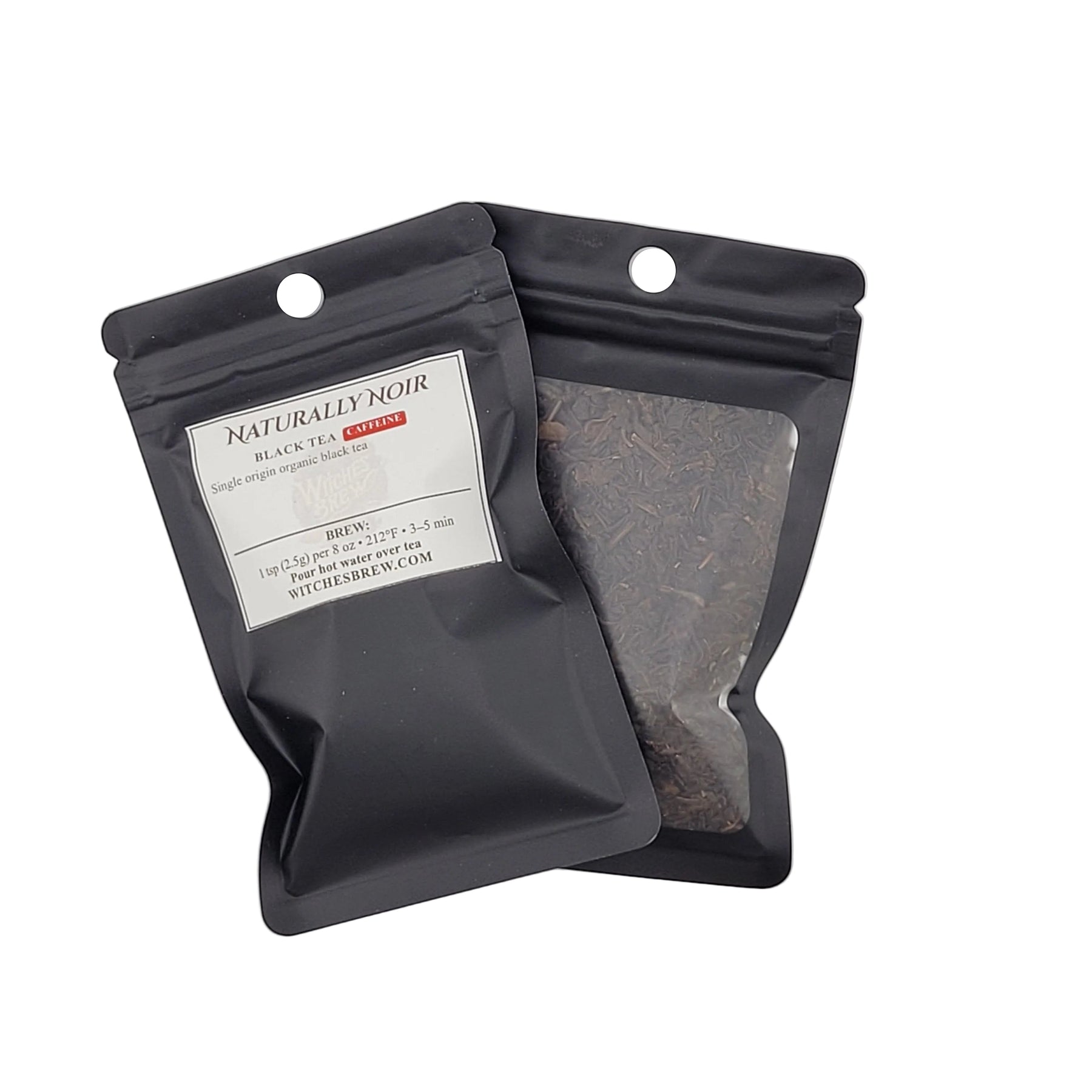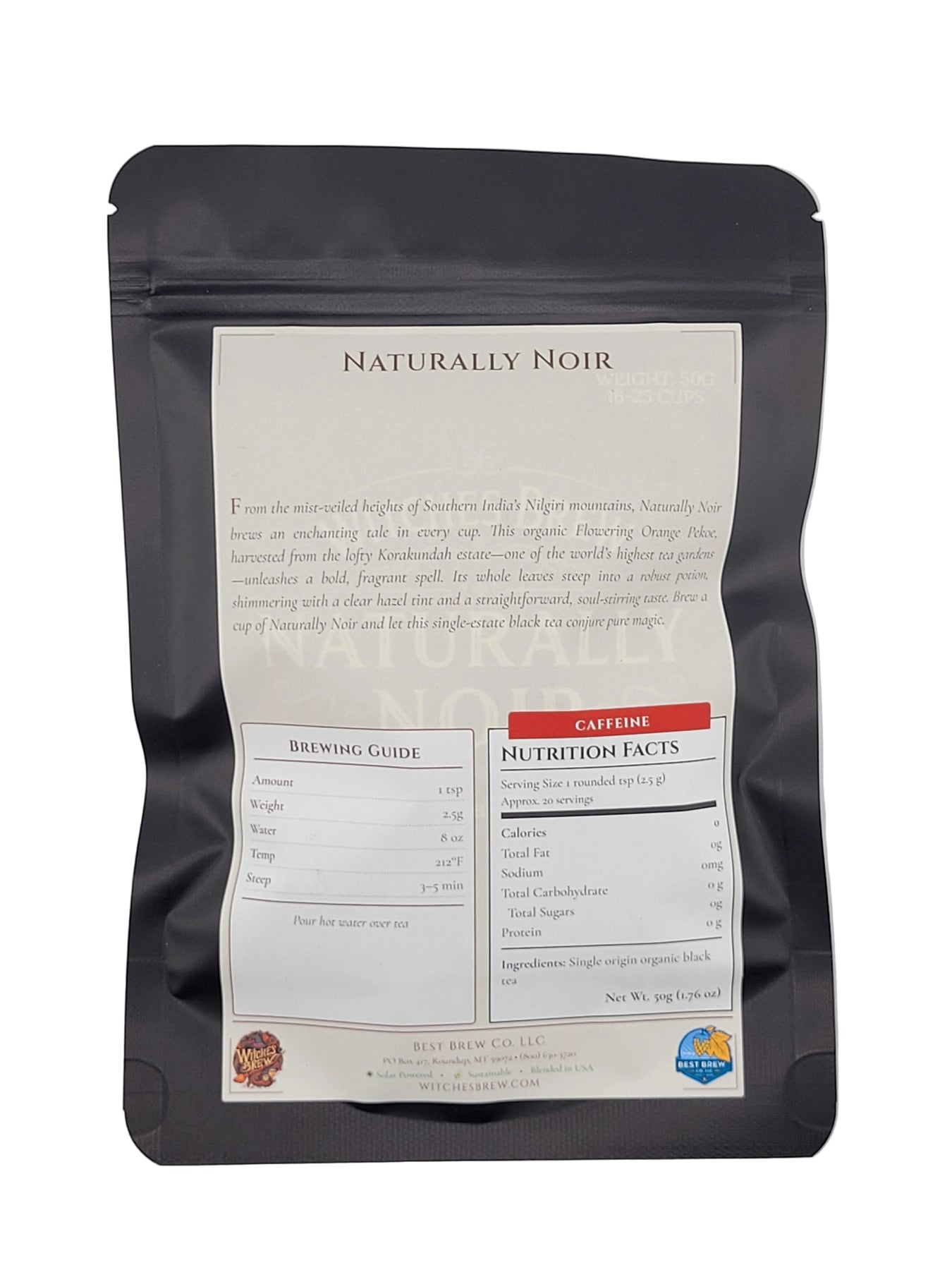 Tea package labeled 'Naturally Noir' by Witches Brew on a white background