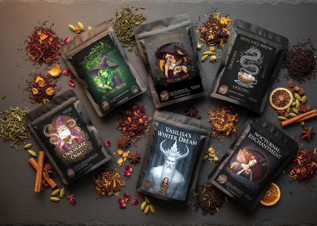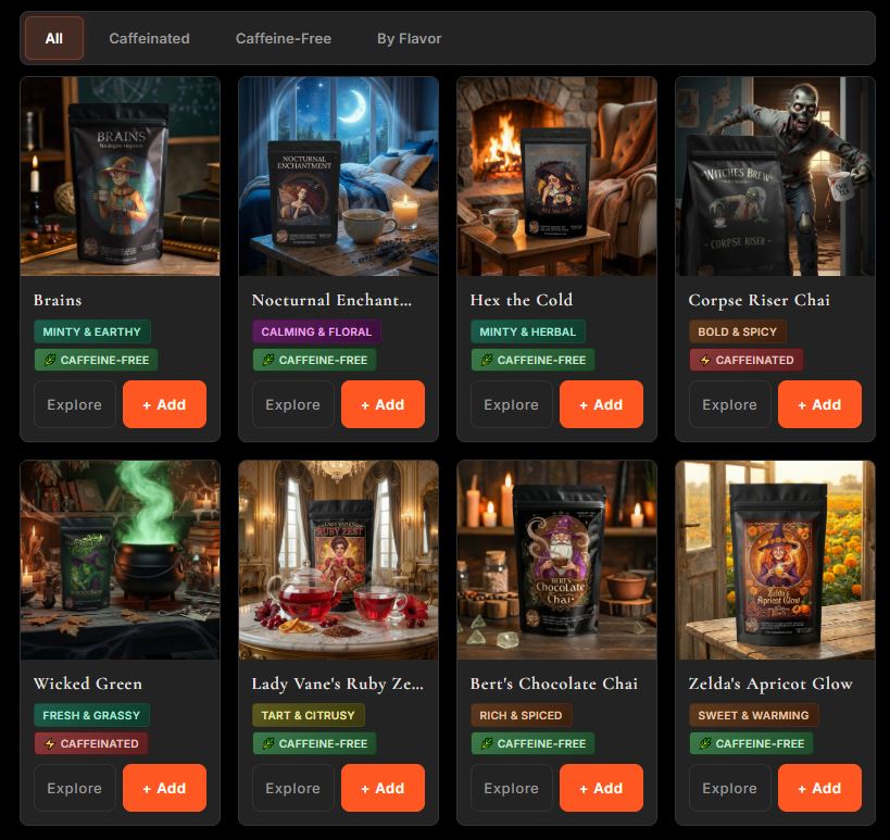 Every potion starts with the right ingredients. Browse over 20 premium loose-leaf teas and tisanes — from the bright kick of Dragon's Charm Oolong to the midnight calm of Nocturnal Enchantment. Filter by caffeine level or flavor to find exactly what calls to you, and tap *Explore* on any blend to uncover its full ingredient list, brewing guide, and the story behind the spell.